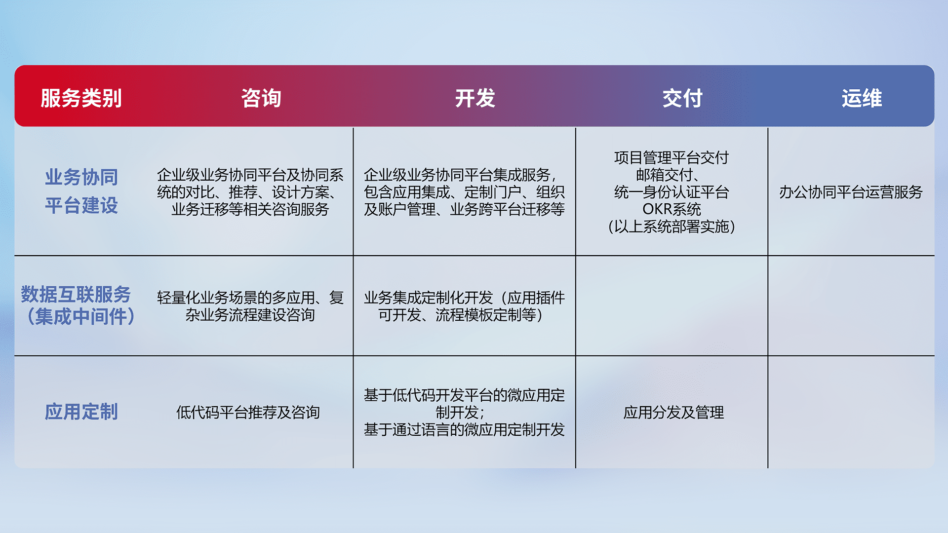 针对钉钉、、、、企微、、、IDaas等平台级产品提供产品的规划、、方案、、交付、、定制化开发等服务,,,实现如统一协同办公、、智能客户服务、、混合会议管理、、、智能数据查询、、、等业务场景,,实现数字化转型。。