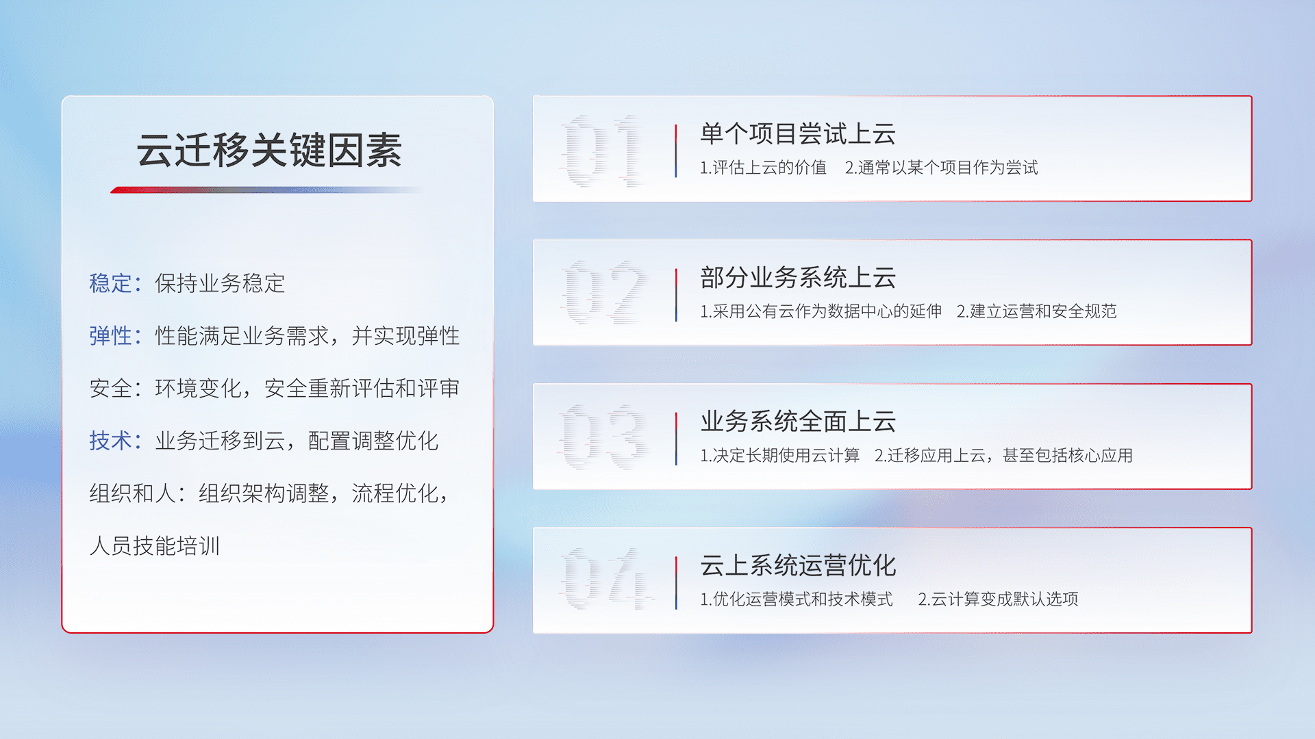 结合实际业务,,,从规划设计、、、、云平台选型、、云原生改造、、、数据迁移、、、集成交付,,,,迁移全过程为客户识别最佳上云路径,,,,做好风险识别管理,,,设计网络架构、、身份权限、、安全审计合规、、操作审计、、日志审计、、、、监控告警策略、、多站点容灾设计等,,,对云上基础设施进行整体规划,,提升IT治理水平,,,以满足弹性、、、、高可用、、、、高性能的需求。。